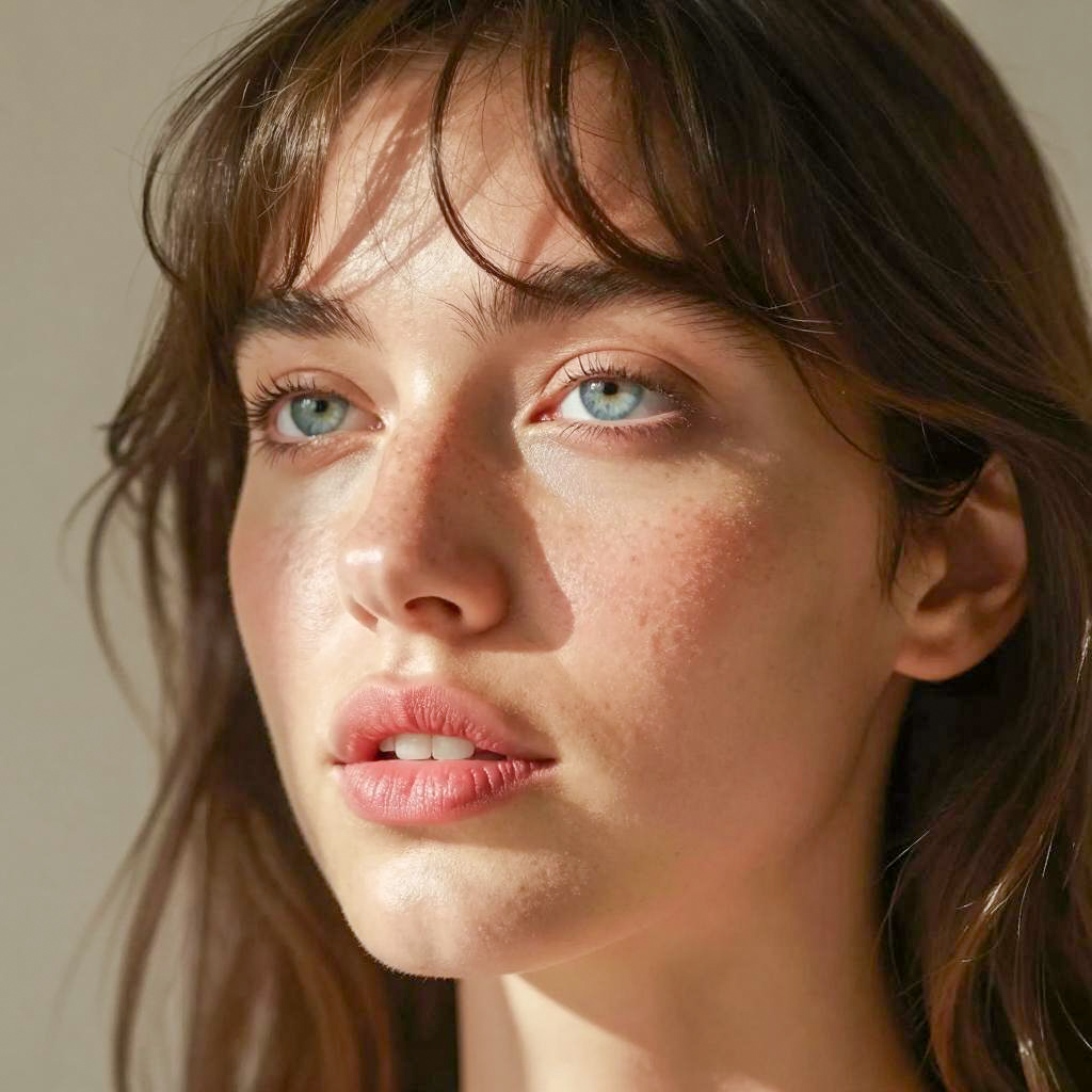 Close-up photograph of a woman with light brown skin, blue eyes, and full pink lips. She has dark brown, slightly wavy hair with bangs. Sunlight casts diagonal shadows across her face. Her mouth is slightly open, revealing white teeth. She has light freckles on her cheeks and nose. The lighting highlights her smooth skin ure. Her gaze is directed upward to the left.