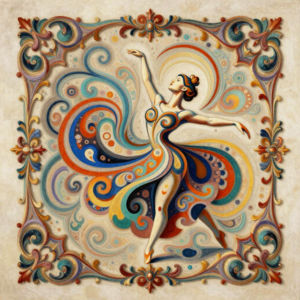 Abstract dancer, (delicate baroque style), (intricate ornamental leafy curls), vibrant colors, (multiple abstract elements), bold patterns, dynamic shapes, sophisticated textures, high depth, artistic composition, captivating atmosphere, (blending European classical cultural fusion), harmonious color palette, visually striking, 4K, ultra-detailed visuality.