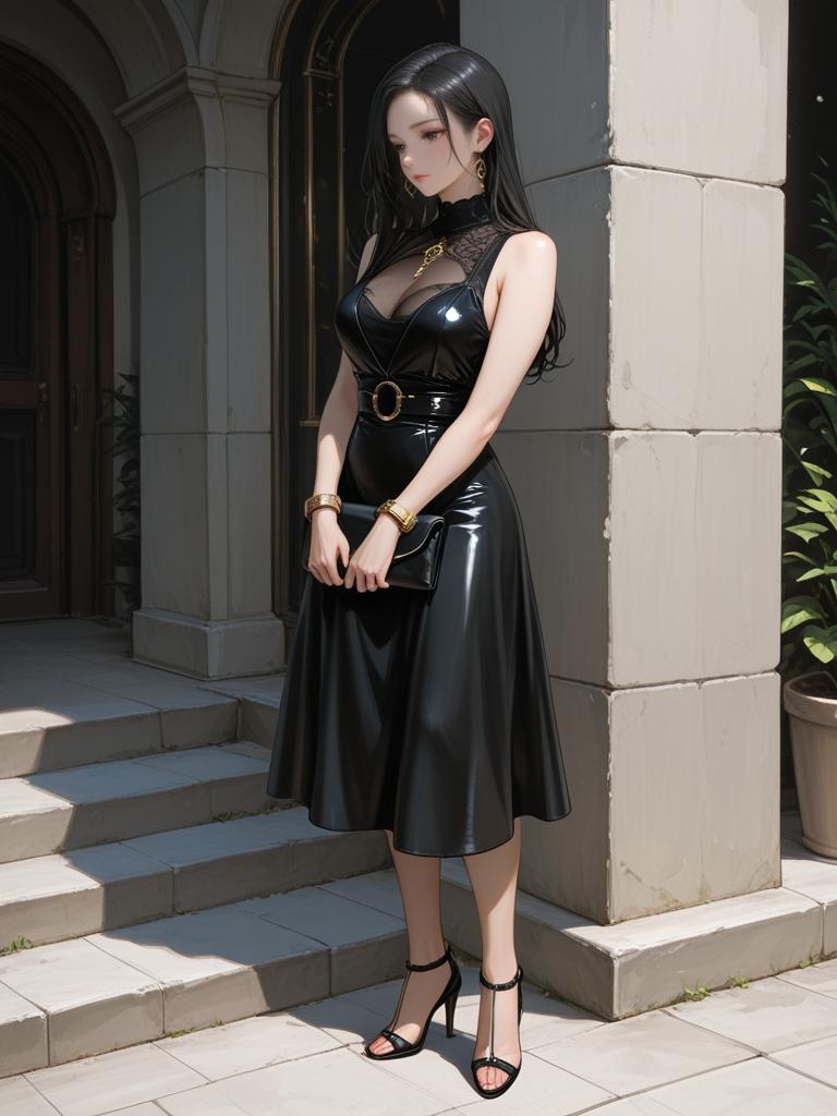 1girl, realistic face, full body shot, Woman, trendy fashion, black and gold striped fitted mock turtleneck top with long sleeves, burgundy velvet flared mini skirt, black leather shoulder bag with chain strap.