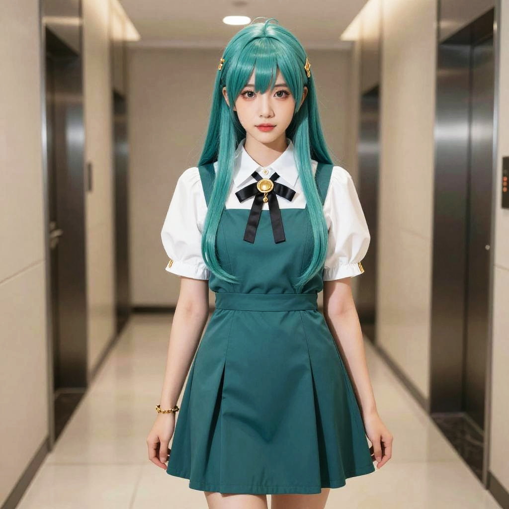 A stylish young woman with long teal hair stands confidently in a modern, well-lit corridor. She wears a fashionable layered outfit featuring a white blouse with puffed sleeves under a teal dress, accessorized with gold jewelry, embodying a chic and contemporary anime art style.