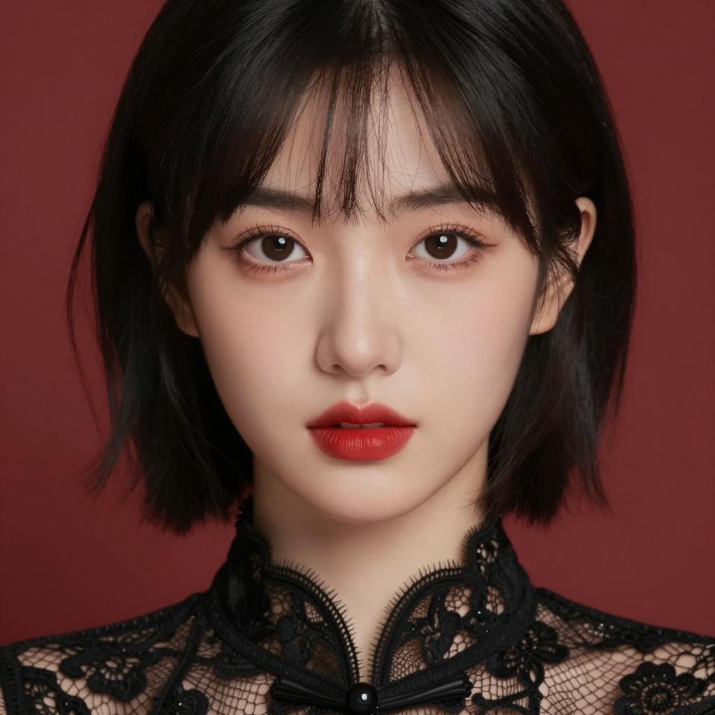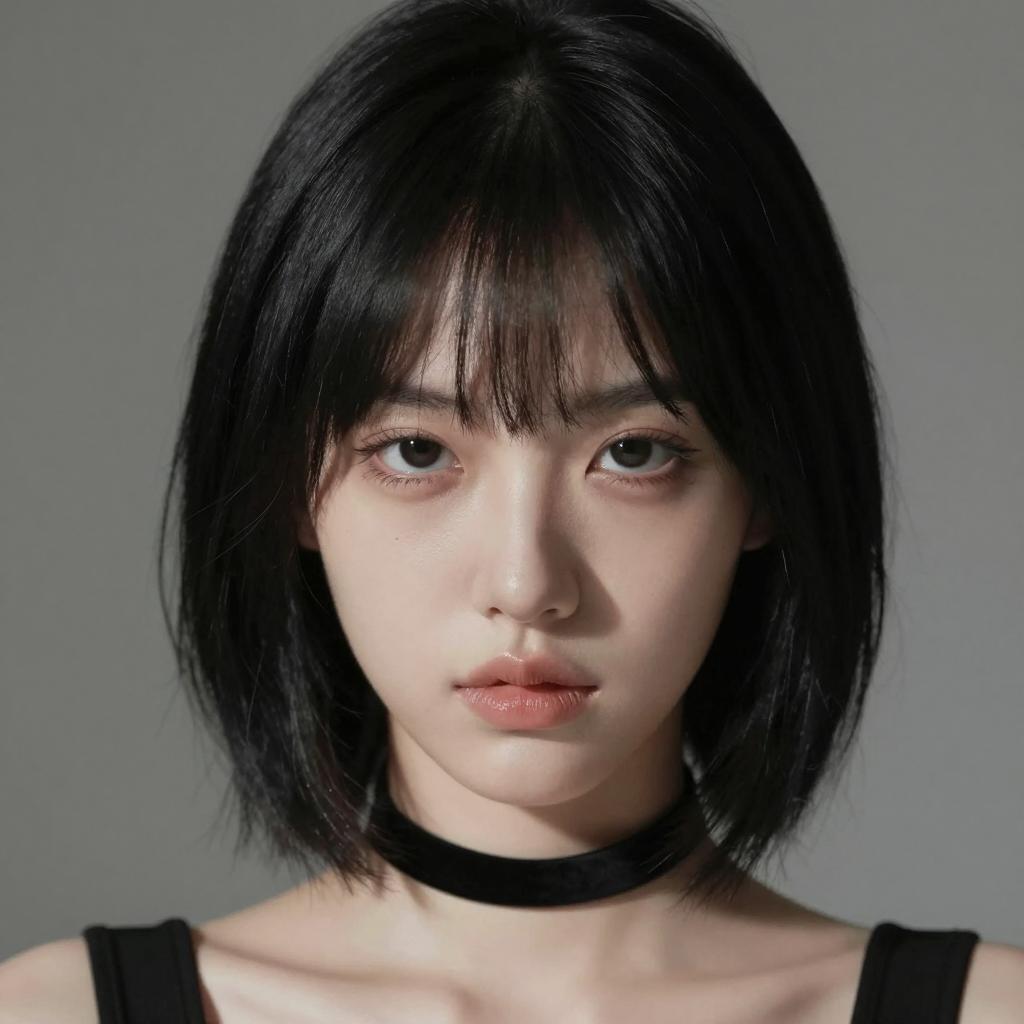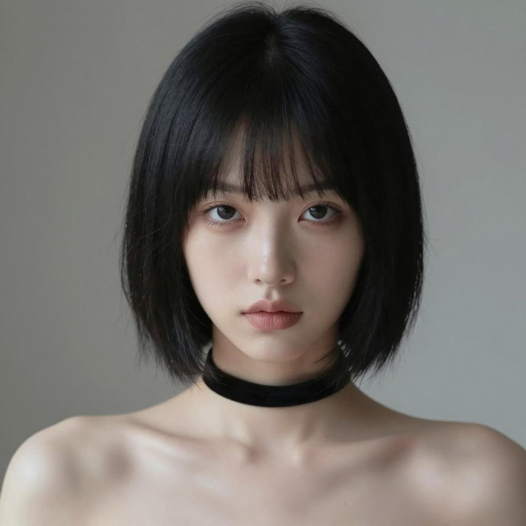 Close-up photograph of a young woman with short black hair, brown eyes, and light skin. She wears a purple top and a black choker. Her lips are slightly parted, and her expression is neutral. The background is blurred and dark.