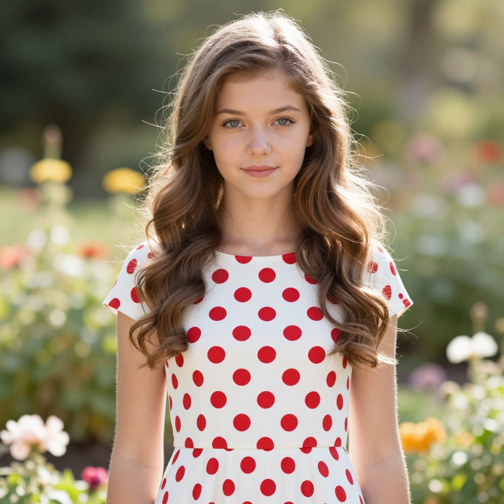 Photograph of a young woman with long, wavy brown hair standing in a sunlit garden. She's wearing a white dress with large red polka dots, short sleeves, and a simple round neckline. The background is a blurred garden with colorful flowers and greenery. She has a fair complexion, blue eyes, and a subtle smile. The sunlight creates a soft glow around her hair.
