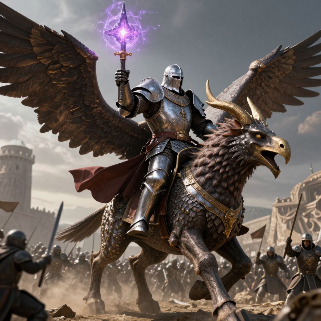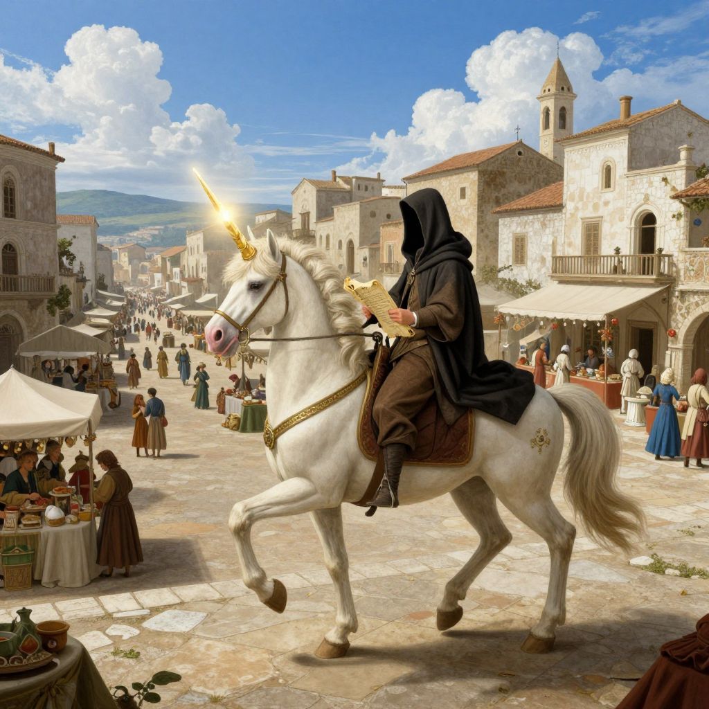 Digital illustration of a hooded figure riding a white unicorn with a glowing horn in a bustling medieval market square.
