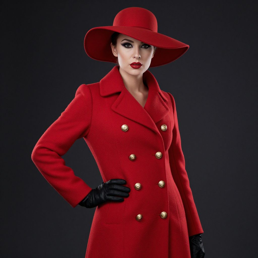 Photograph of a stylish woman in a vibrant red coat with gold buttons, black gloves, and a wide-brimmed red hat, posing confidently against