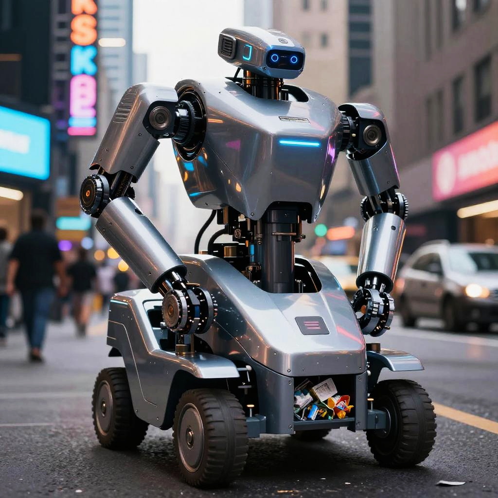 Trash compacting robot, futuristic design, sleek metallic body with hydraulic arms, compacting garbage in a bustling city street, neon lights reflecting on robot surface, cyberpunk style, ultra-detailed, 4k