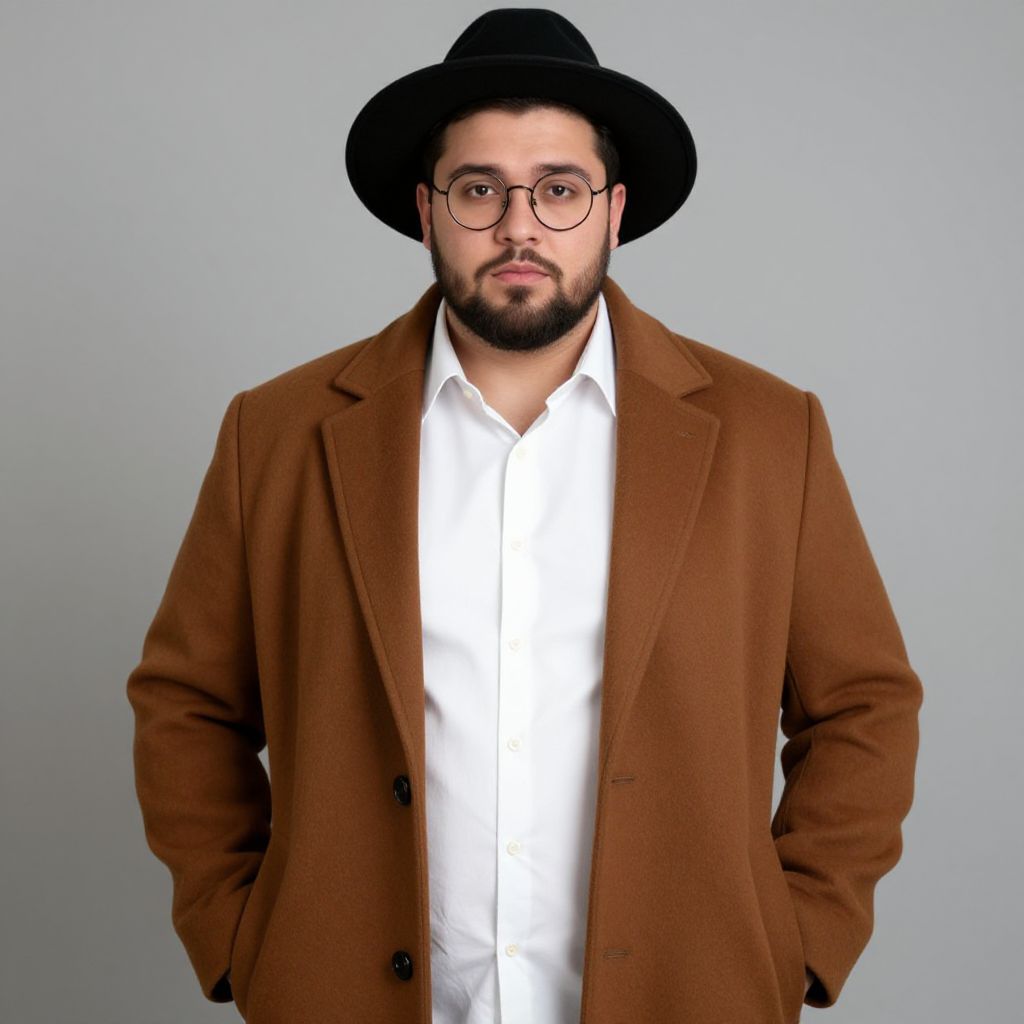 "male plus size fashion, 1boy, male focus, solo, facial hair, glasses, hat, hands in pockets, simple background, coat, white shirt, beard, shirt, black hair, grey background, brown coat, round eyewear Realistic photo of casual sexy person with pretty face"