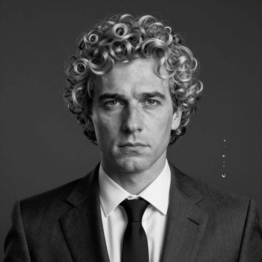 Black and white photograph of a man with short, dark hair, light skin, and intense gaze. He wears a dark jacket with a high collar and a light shirt underneath. His expression is serious. Background is dark and blurred.