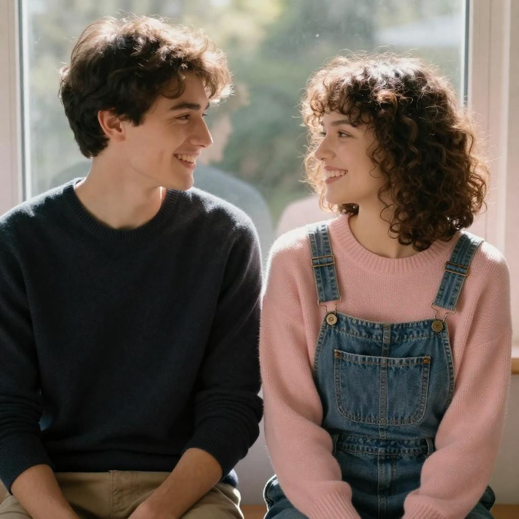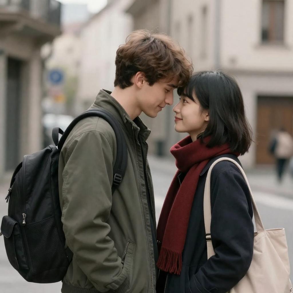 A young couple standing close and facing each other on a city street. The man has brown hair and is wearing a green jacket with a black backpack. The woman has short black hair, dressed in a dark jacket with a red scarf and carrying a beige bag. They are touching foreheads, sharing an intimate moment with a blurred urban background.