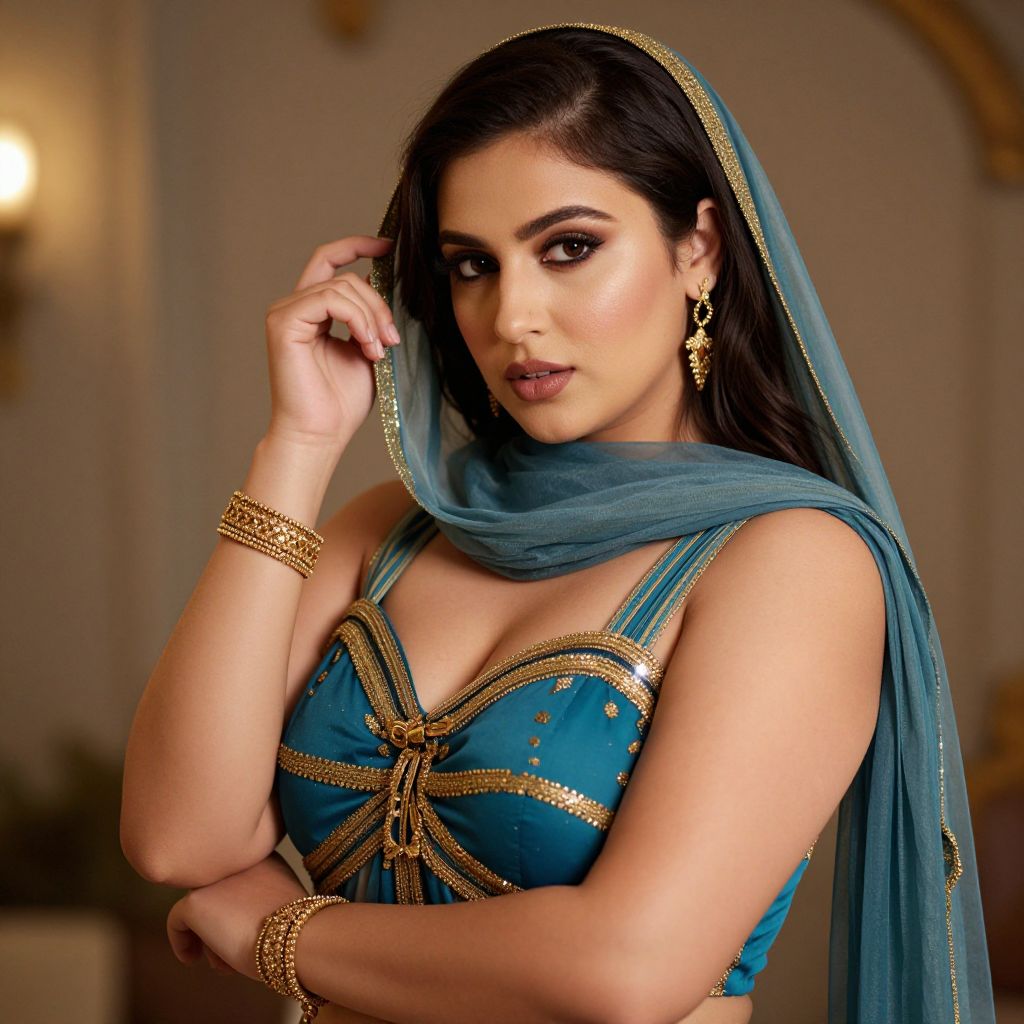 A woman with a voluptuous figure, full curves, and a confident, seductive demeanor is wearing a stunning blue dress with intricate gold embroidery, paired with a delicate headscarf. She adorns a sparkling gold bracelet on her left wrist and elegant gold earrings in her ears, exuding a sense of sophistication, allure, and sensuality. Her features are striking, with a captivating gaze and an air of mystery, making her both elegant and irresistible. The scene is set in a soft, glowing ambient light, enhancing her beauty and creating a dreamy, enchanting atmosphere.