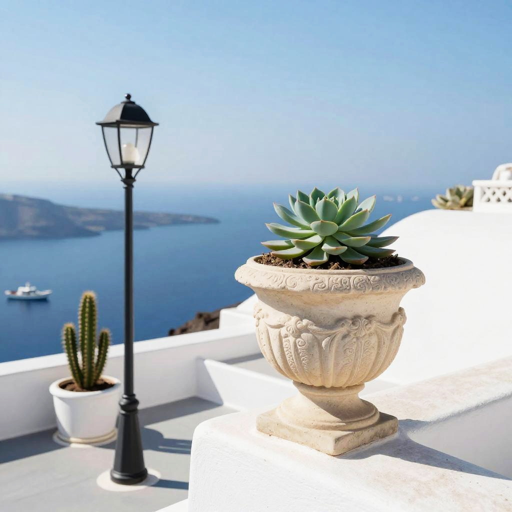 Photograph of a sunny coastal scene. In the foreground, a beige, ornate stone planter with a green succulent sits on a white, curved rooftop. To the left, a black, modern lamp stands next to another small planter with a cactus. The background features a bright blue sea with a small boat and a hazy blue sky. The overall vibe is relaxed and Mediterranean.