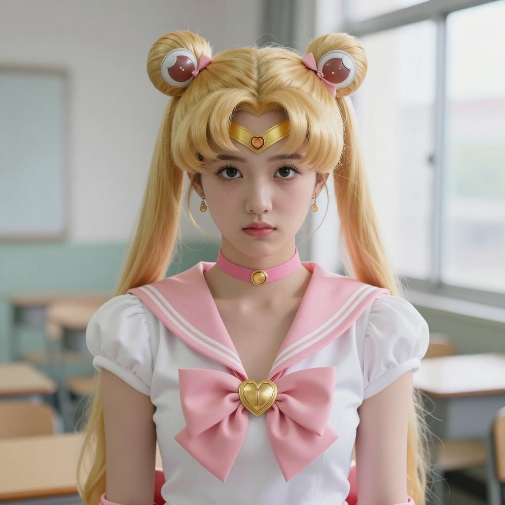 Pink sailor moon costume, photo of asian girl, anime style, cute, pink sailor uniform, puffed sleeves, pink choker, double buns hairstyle, pink ribbons, serious expression, soft light, blurred background, indoor, daylight, realistic ure, model portrait, 3/4 view, focused face, casual setting