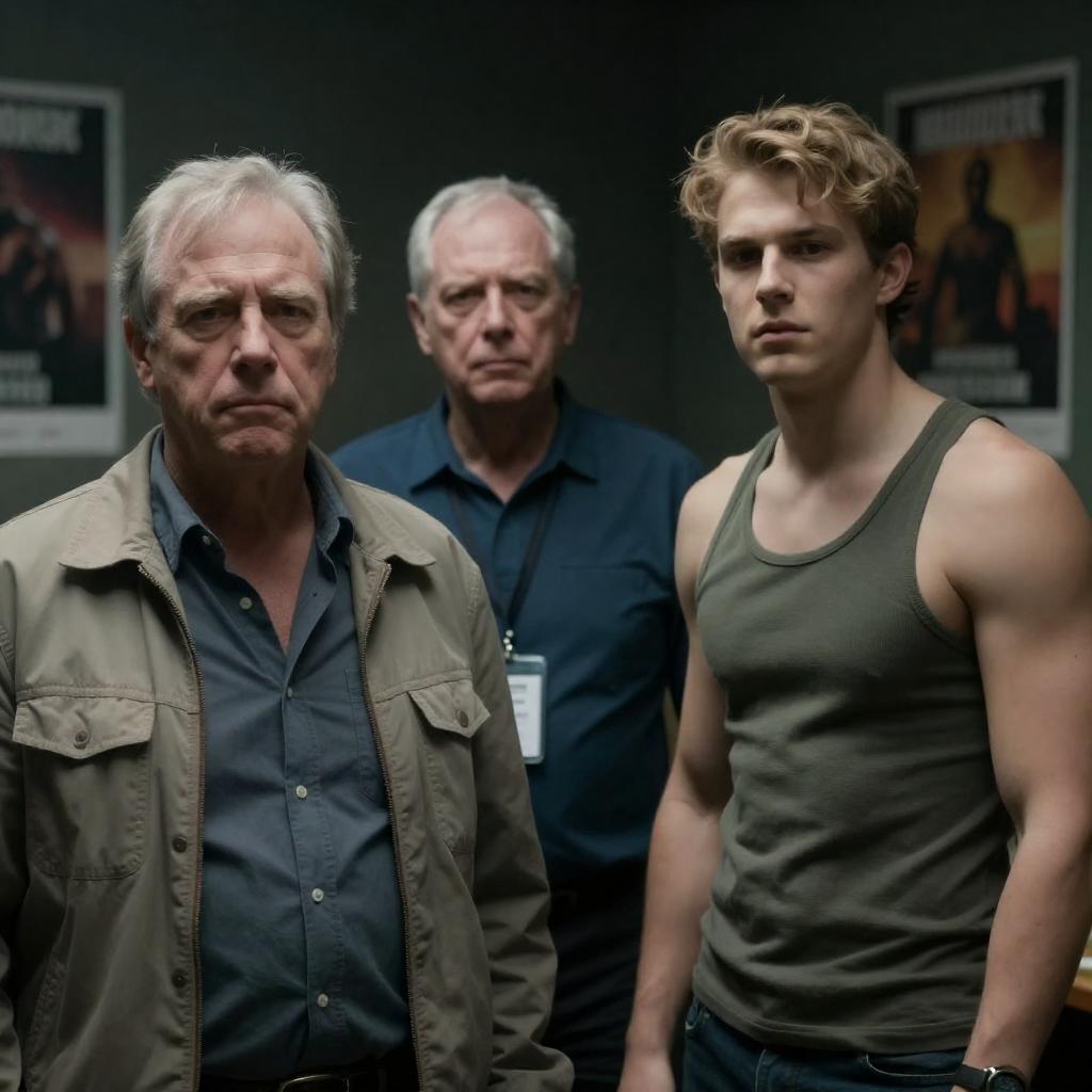 Four men in a dimly lit, metallic room. Naked man with muscular back stands to left, three men in disheveled clothes to right. Left man has short brown hair, others have varied hair styles. All have intense expressions. One wears leather jacket, others in shirts and jackets. Metal ceiling and walls in background.