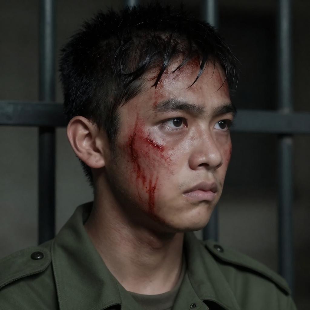 Close-up photograph of a man's face with dark, blood-streaked skin, eyes closed, and mouth open in a scream. His face is illuminated with a harsh, dramatic light, highlighting sweat and blood. The background is dark and indistinct. The man's expression conveys intense pain or fear.