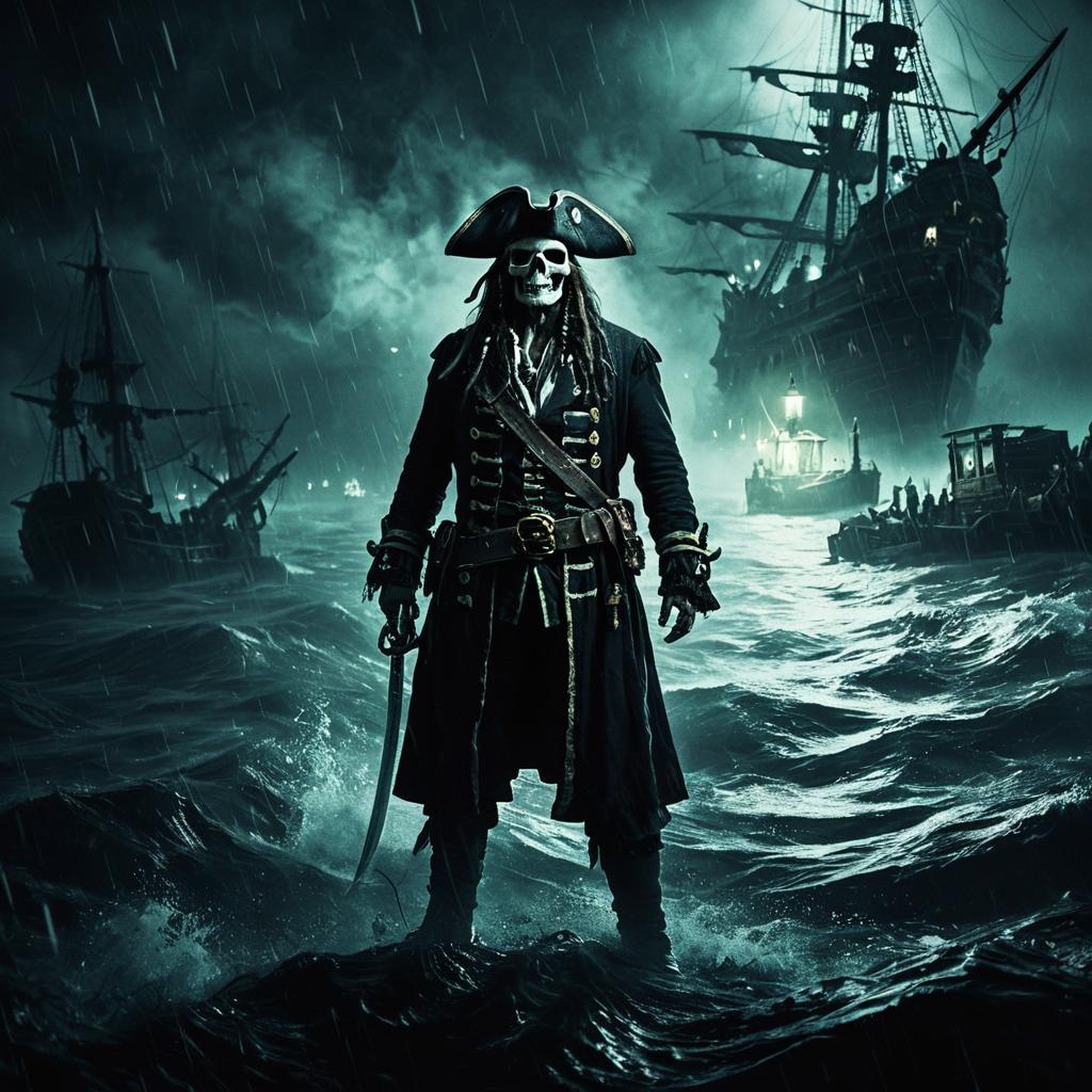 A ghostly pirate captain stands menacingly in a murky, spectral harbor surrounded by floating phantom ships. The pirate is dressed in classic 18th-century attire with a tricorn hat and a flowing coat, holding a curved sword. The scene is dark and atmospheric, with glowing mist and rain creating an ominous mood over turbulent waters.