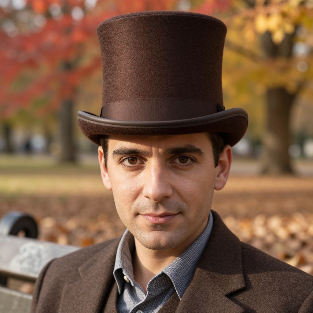 A man stands confidently in a sunny park setting, wearing a clean blue shirt with a red and white striped scarf wrapped neatly around his neck, adding a vibrant pop of color to his outfit. He wears a gray wool hat tilted slightly to one side, giving him a casual yet stylish look. The man has short, well-groomed dark hair, a friendly expression, and a slight smile, exuding warmth and approachability. The background features lush green trees, soft sunlight filtering through the leaves, and a gentle breeze adding movement to the scene, creating a serene and inviting atmosphere.