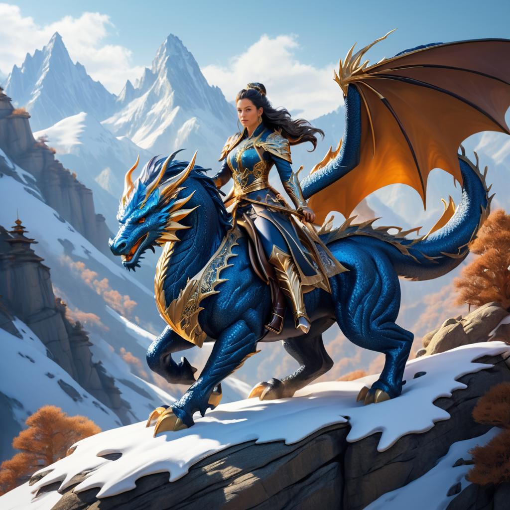 Digital illustration of a fierce female warrior clad in blue and gold armor, riding a majestic blue dragon adorned with golden accents. The dragon and rider are positioned on a snowy mountain ledge with a dramatic backdrop of rugged, snow-capped peaks under a clear sky. The warrior holds a spear and wears a flowing maroon cape, embodying strength and fantasy epic adventure.