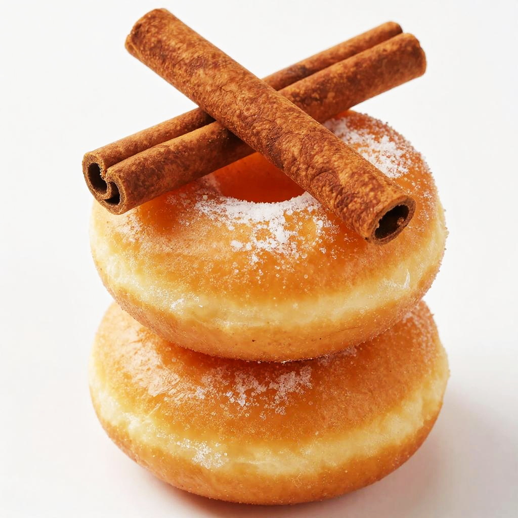 Close-up of two golden-brown doughnuts lightly dusted with powdered sugar, stacked on top of each other. Two textured cinnamon sticks rest on the top doughnut. The image is set against a bright white background, highlighting the warm colors and glossy texture of the doughnuts and the rustic look of the cinnamon sticks.