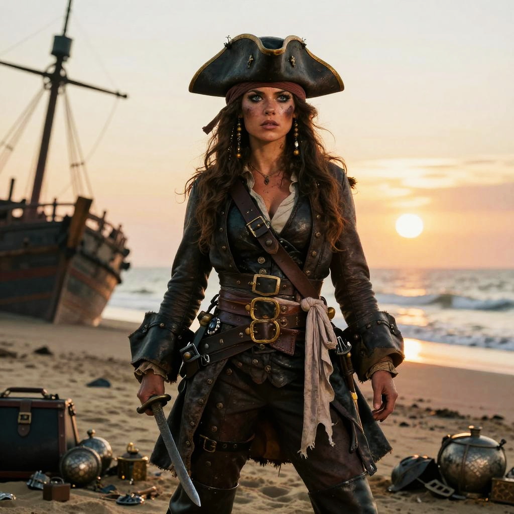Realistic female pirate art of a sea rogue standing on a sandy beach at sunset, wearing a tattered tricorn hat and a flowing coat, holding a cutlass, with weather-beaten skin and expressive eyes, surrounded by pirate treasure and rugged shipwreck elements.