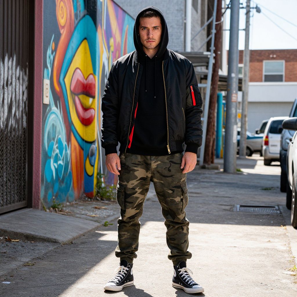 "a man, fitted black hoodie, camo print joggers, high-top canvas sneakers, bomber jacket, bold color accents, vibrant murals, urban decay, sunlit alleyway, chromogenic film, confident expressionMan has masculine face and piercing eyes"