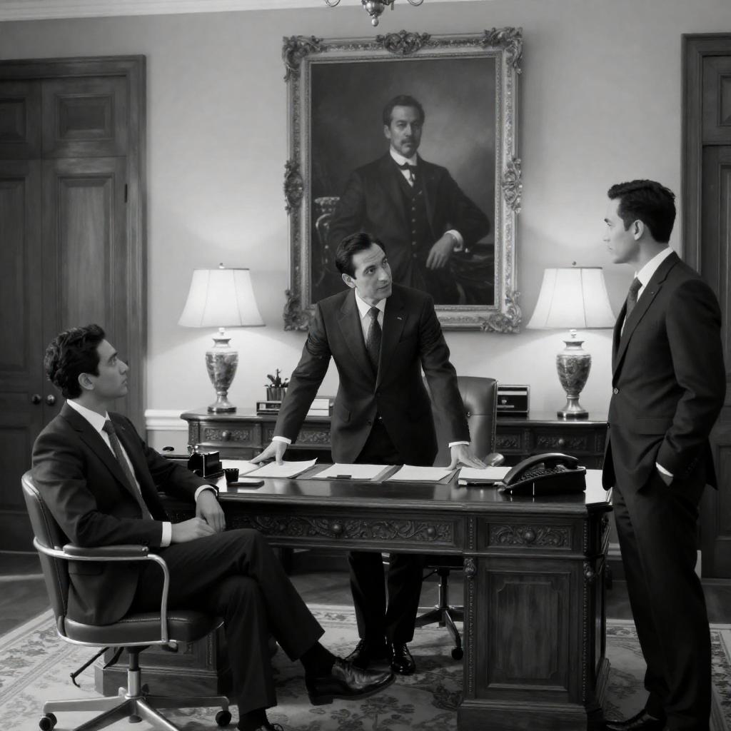Black-and-white photograph of three men in formal dark suits engaged in a serious discussion within an elegant, ornately decorated office. Central man leans on a classic wooden desk with documents, flanked by table lamps. One man is seated relaxed while the other stands confidently with hands in pockets. A large framed portrait and polished wood paneling enhance the sophisticated atmosphere.