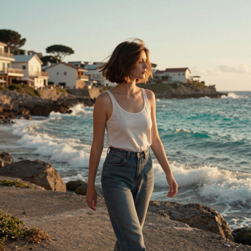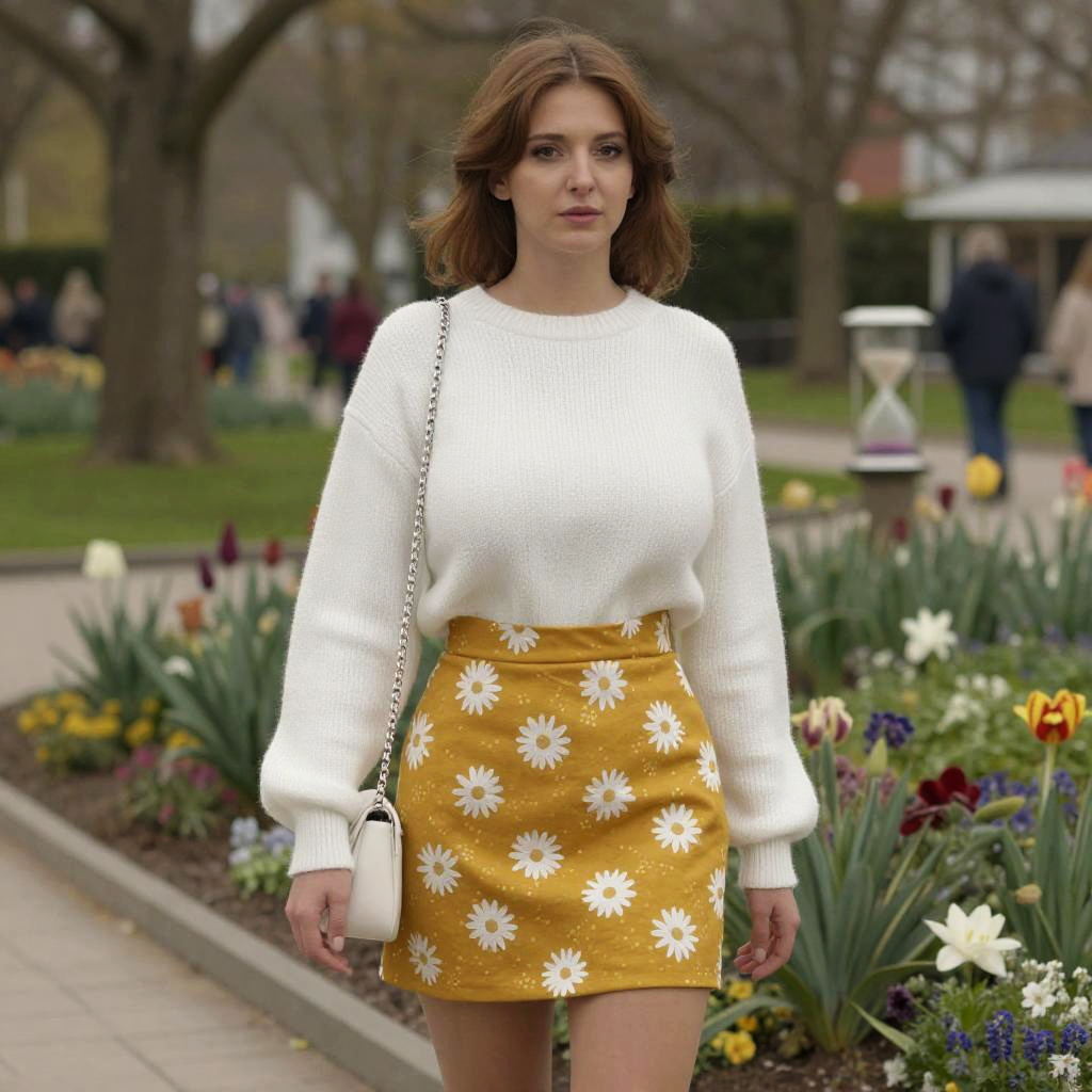 A lean woman in a casual summer yellow and white gingham mini dress with spaghetti straps and white classic low-top sneakers stands at a fashionable boardwalk in Ocean City, capturing the vibrant essence of Richard Estes' visual style. Sexy. Pretty face and beаutiful eyes. Big breasts
