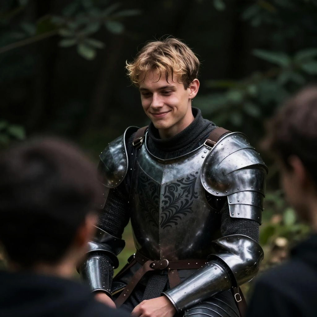 Photograph of a young man with shoulder-length blonde hair, wide blue eyes, and gritted teeth. He wears a green jacket, crouched in a forest with blurred tree branches in the background. A knife is partially visible on the left.