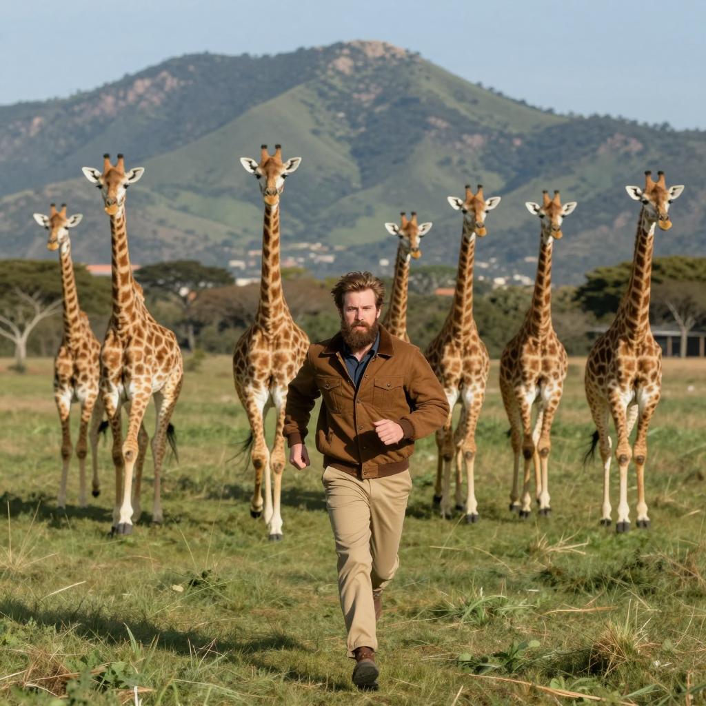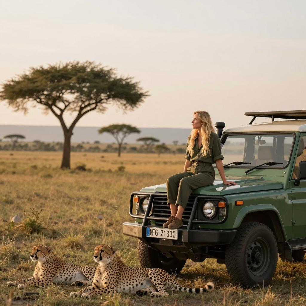 Man in red "HAWAII" shirt stands next to a cheetah wearing a green collar, right arm around cheetah. Man has short brown hair, relaxed expression. Cheetah has focused expression. Silhouetted lion in background, sunset sky with red and yellow gradient. Man and cheetah on right, lion on left. Tree on right.