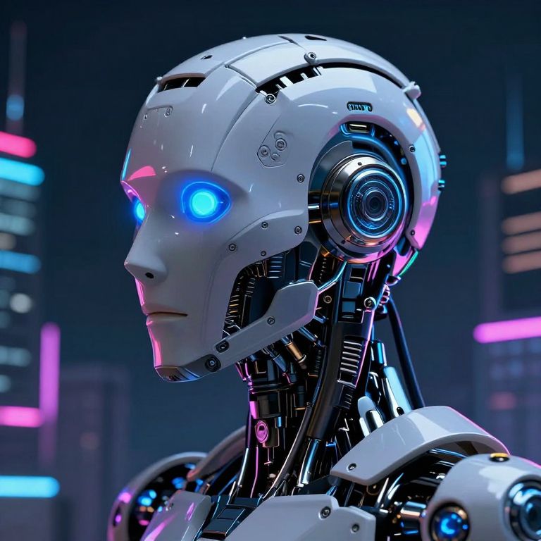 Profile close-up of a futuristic android with intricate mechanical details and glowing blue eyes, set against a dark neon cityscape background, emphasizing the sleek design and advanced technology.