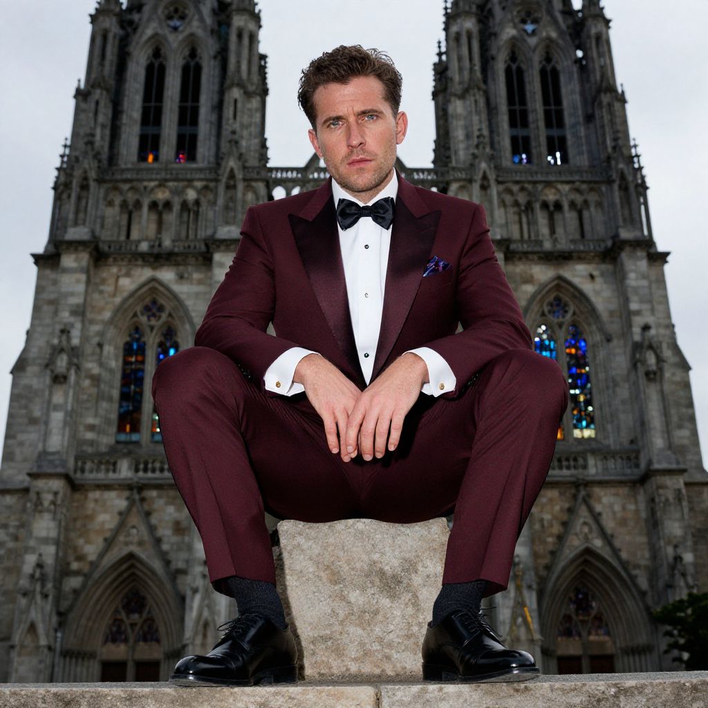 Photograph of a handsome Caucasian man with short, dark brown hair, wearing a dark burgundy tuxedo with a black bow tie and white shirt, sitting on a stone ledge in front of a Gothic cathedral. His legs are spread apart, and he rests his hands on his knees. The cathedral's detailed architecture, including tall spires and colorful stained glass windows, is visible in the background. The man's expression is serious, and he is wearing black dress shoes. The sky is overcast, providing soft, diffused lighting. The image has a slightly digital, hyper-realistic style.