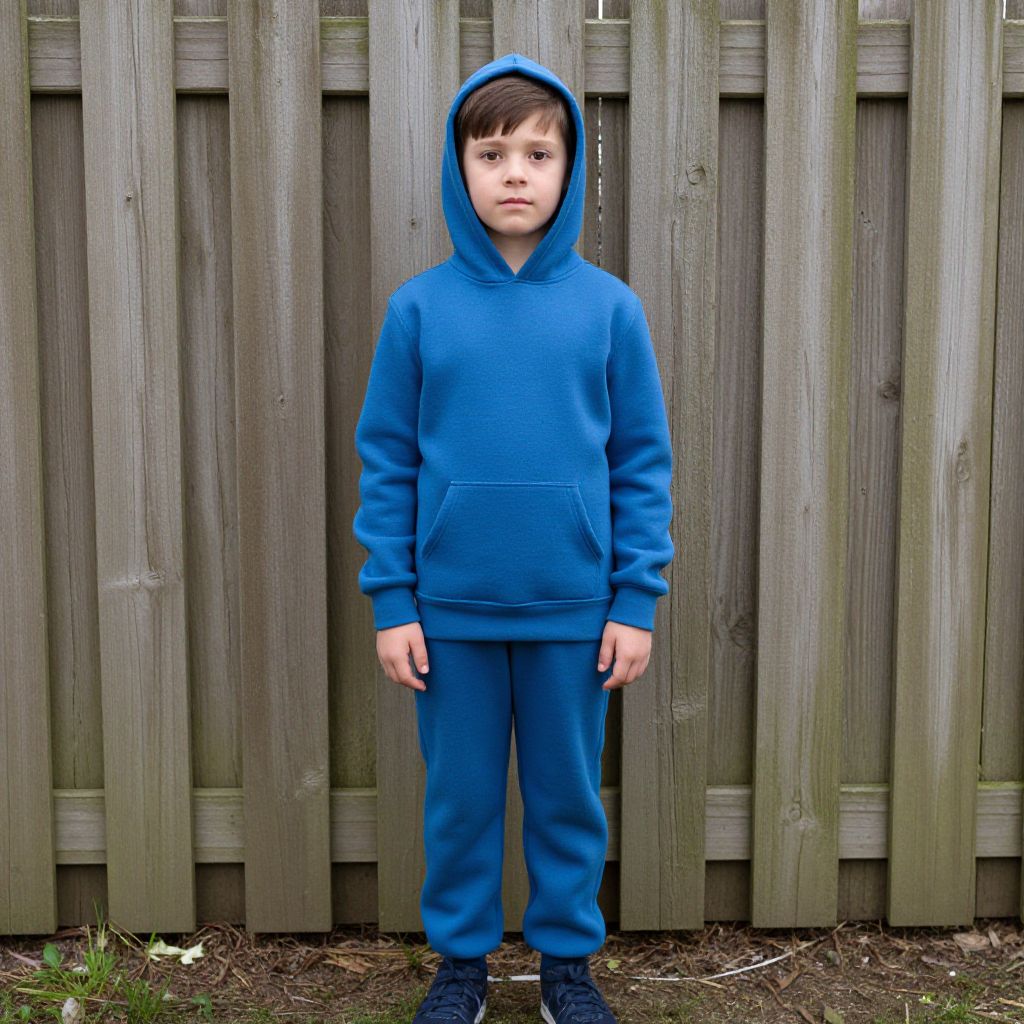 Photograph of a young boy with pale skin, dark brown hair, wearing a blue hooded sweatshirt and pants, standing in front of a gray