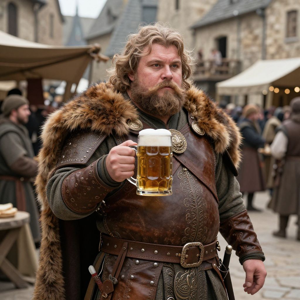 Fat bearded man in a bustling medieval marketplace, wearing leather armor and a fur cloak, holding a large mug of ale, vivid colors, intricate textures on clothing, lively crowd and ancient stone buildings in the background, cinematic lighting, fantasy art style.