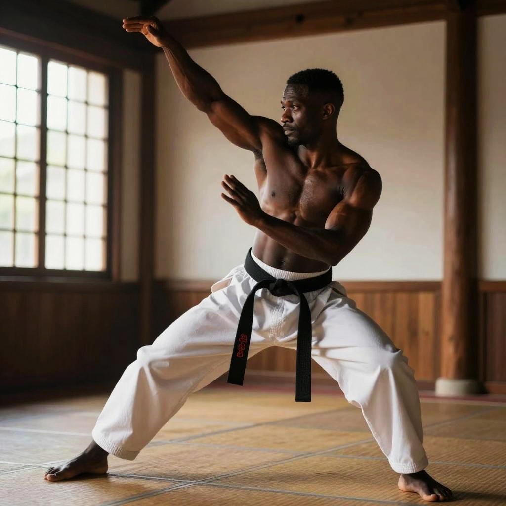 Photograph of a muscular, shirtless Black man in white karate gi performing a dynamic karate stance in a wooden-floored dojo.