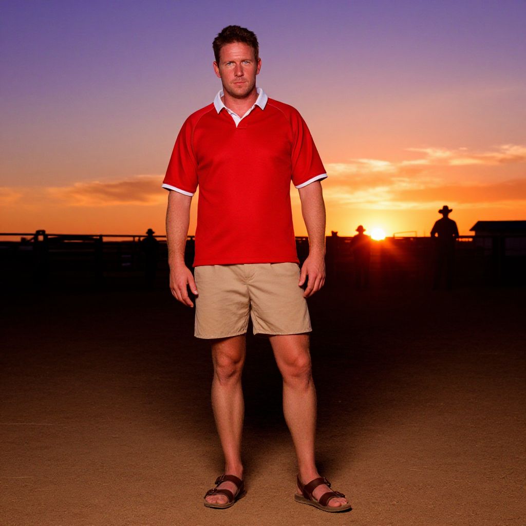 A man, bright red rugby shirt, khaki flat front shorts, brown leather sandals, sporty vibe, sunset over a dusty corral, silhouettes of cowboys, vibrant orange and purple hues, relaxed expression, anscochrome analog film. Man has masculine face and piercing eyes