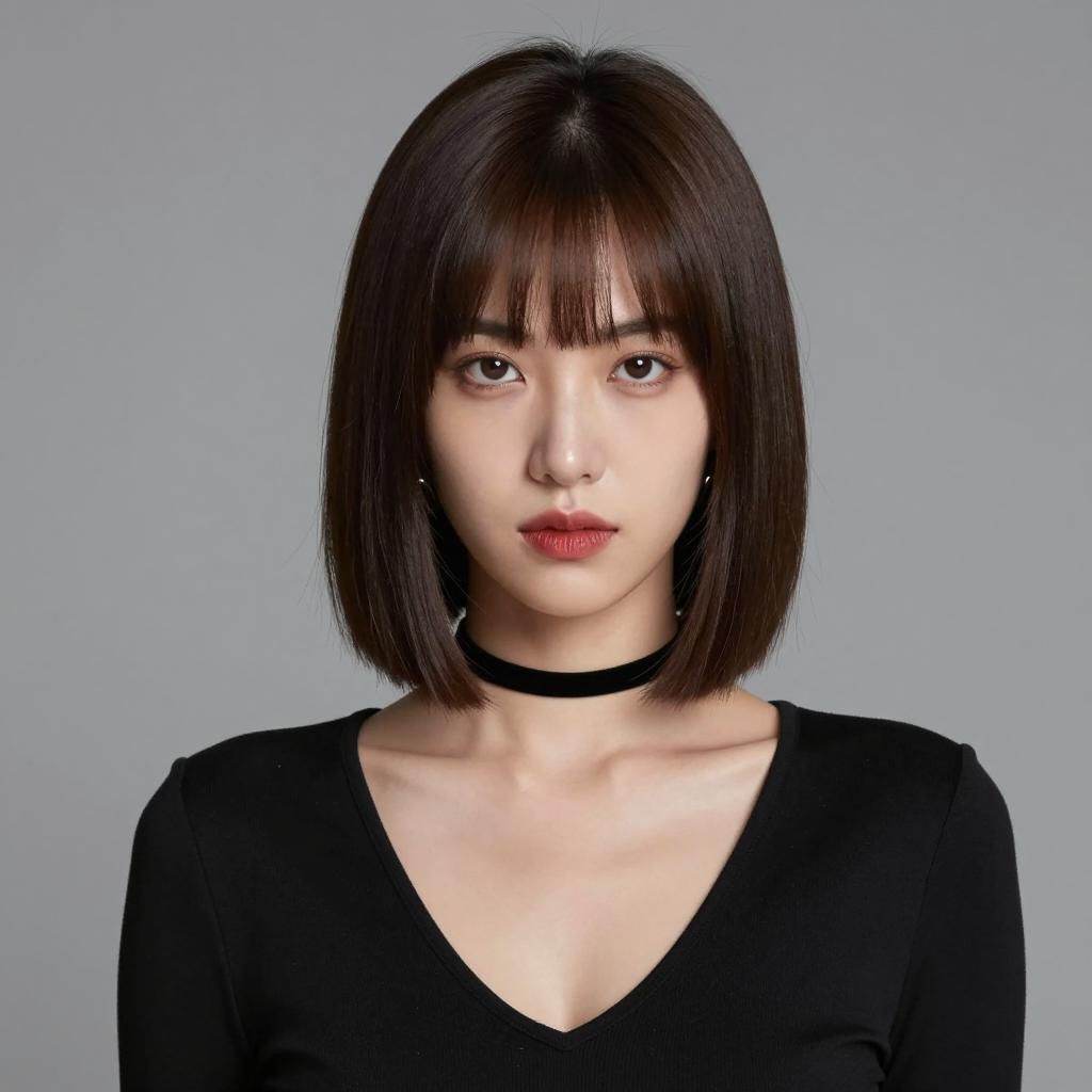 Black wig bob style, photorealistic, portrait of an Asian woman with a bob haircut, black hair, bangs, wearing an off-shoulder dark brown dress, silver necklace with a blue pendant, pink and red roses in the background, soft lighting, detailed ures, subtle makeup, direct gaze, full-body shot, front-facing, slightly blurred background, bright colors, natural setting, realistic digital art, SD/T2I model, beauty, floral, elegant, sophisticated, female, attractive, warm tones
