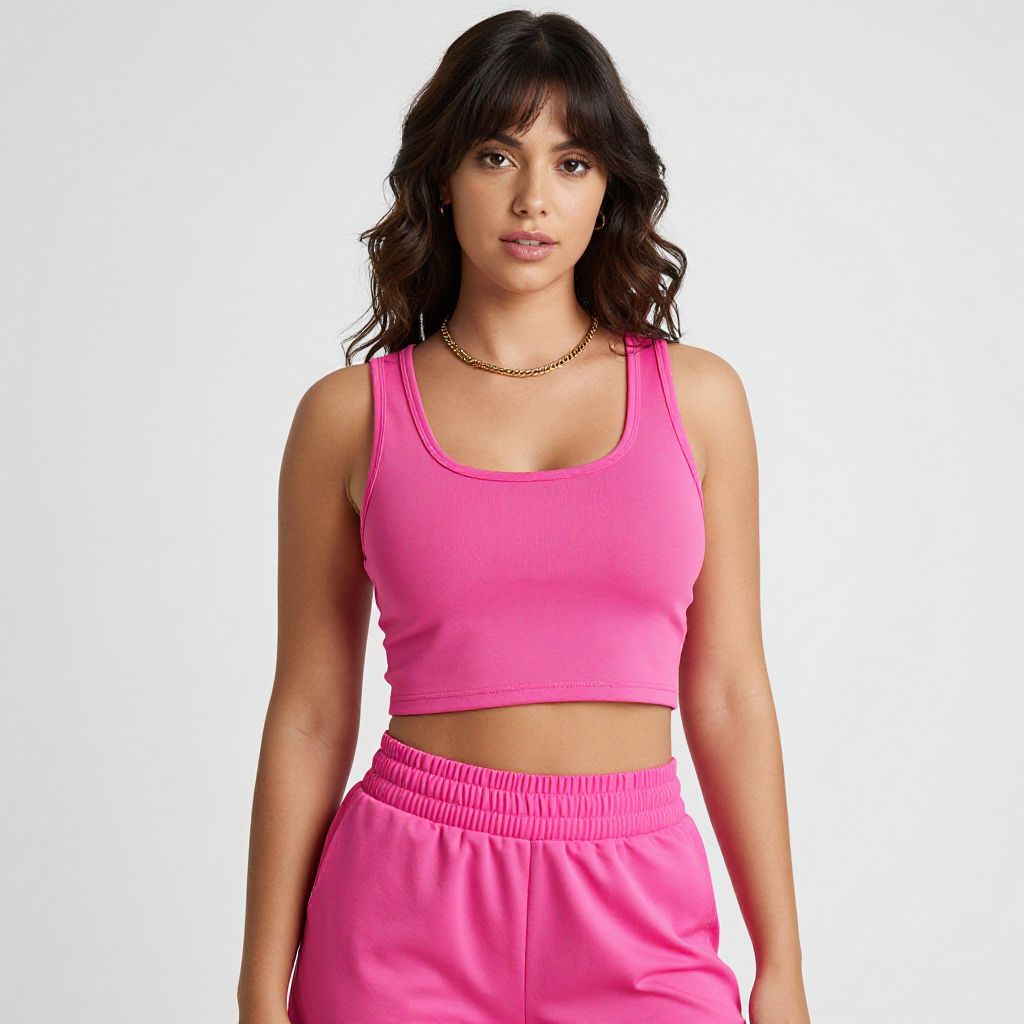 "Woman, sporty casual, bright pink cropped tank top, scoop neckline, sleeveless, matching pink athletic shorts, elastic waistband, relaxed fit, gold chain necklace, wavy hair with bangs, plain white background.. Sexy. Pretty face and beаutiful eyes. Big breasts."
