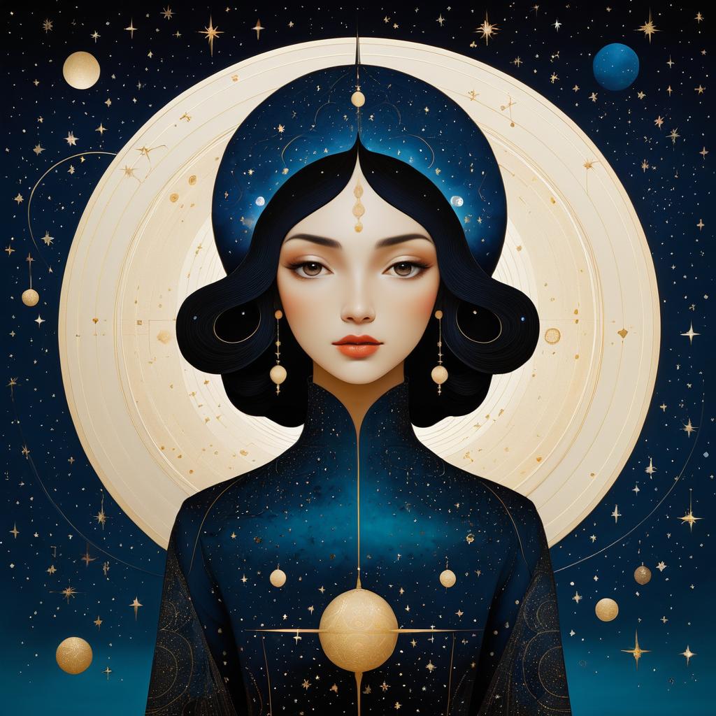Digital illustration of a celestial woman with deep blue hair and a starry halo. She wears a dark blue garment adorned with subtle sparkling details, set against a cosmic background filled with golden stars and celestial bodies in intricate, highly detailed style.