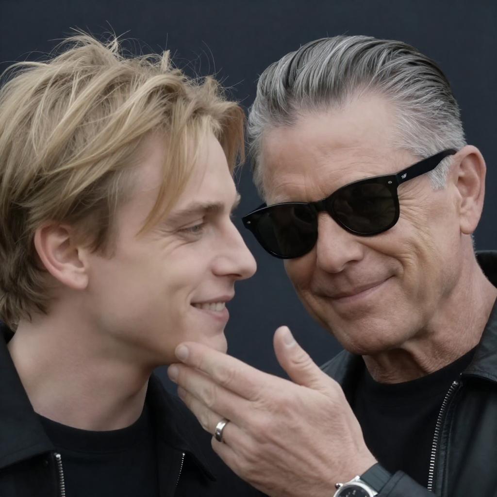 Photograph of two men in close-up. The man on the right has slicked-back gray hair, wears black sunglasses, and smiles slightly, showing wrinkles. The man on the left has messy blond hair, smiles, and leans in. Both wear dark clothing. The background is dark and blurred. The right man's hand is gently touching the left man's chin.