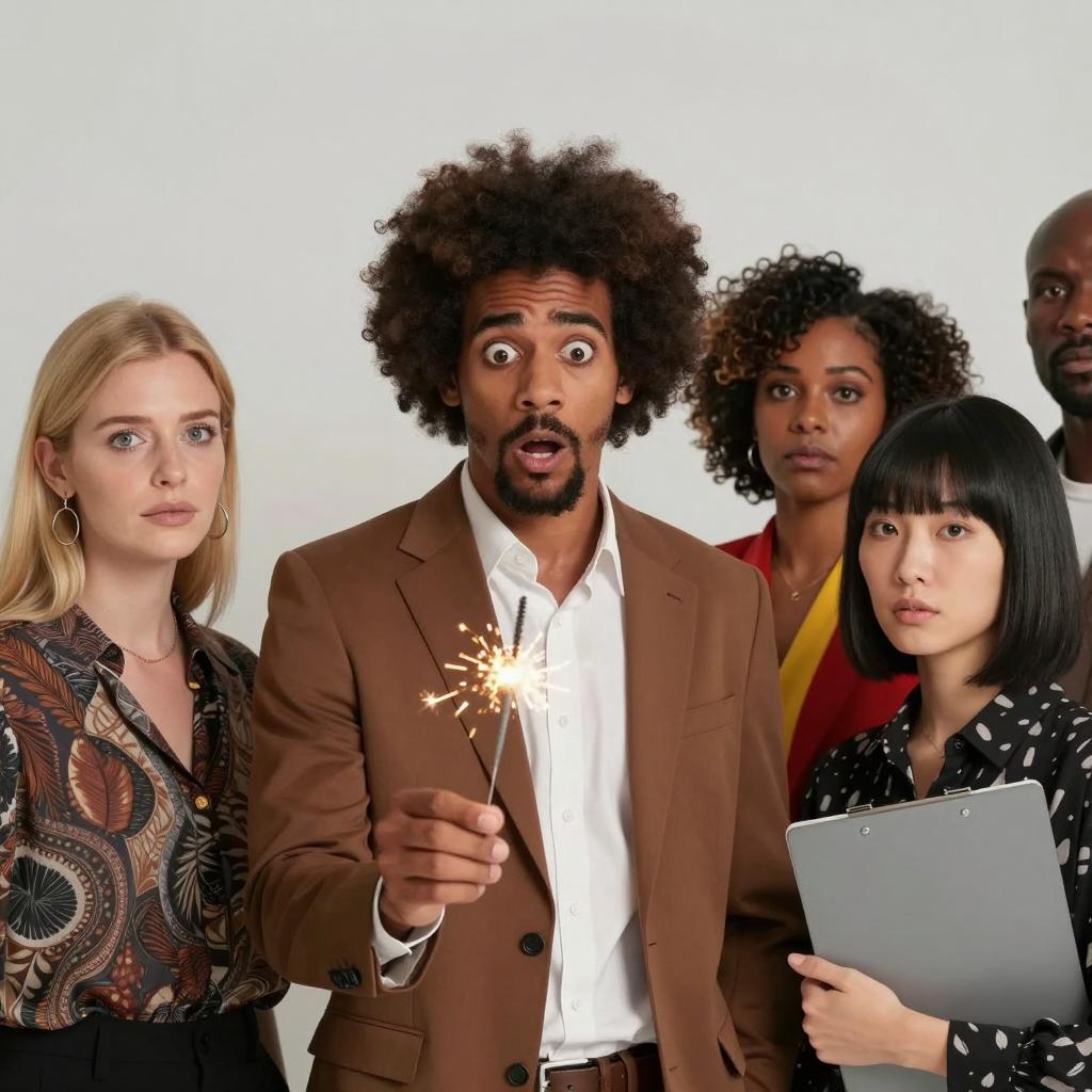 Five people. Center man with large afro, brown suit, white shirt, shocked expression, holds lit sparkler. Blonde woman with patterned blouse, earrings, left. Black woman with curly hair, red and yellow top, center right. Asian woman with short black hair, black patterned blouse, gray clipboard, right. Bald man with brown jacket, partially visible, far right. White background.
