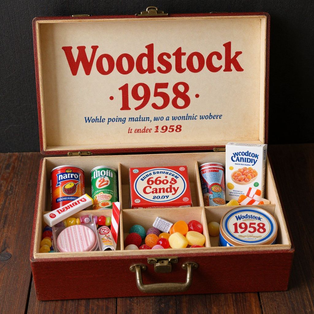 Photograph of an open wooden box labeled "Woodstock 1958" with vintage candy, gum, and soda items, including Necco Waf