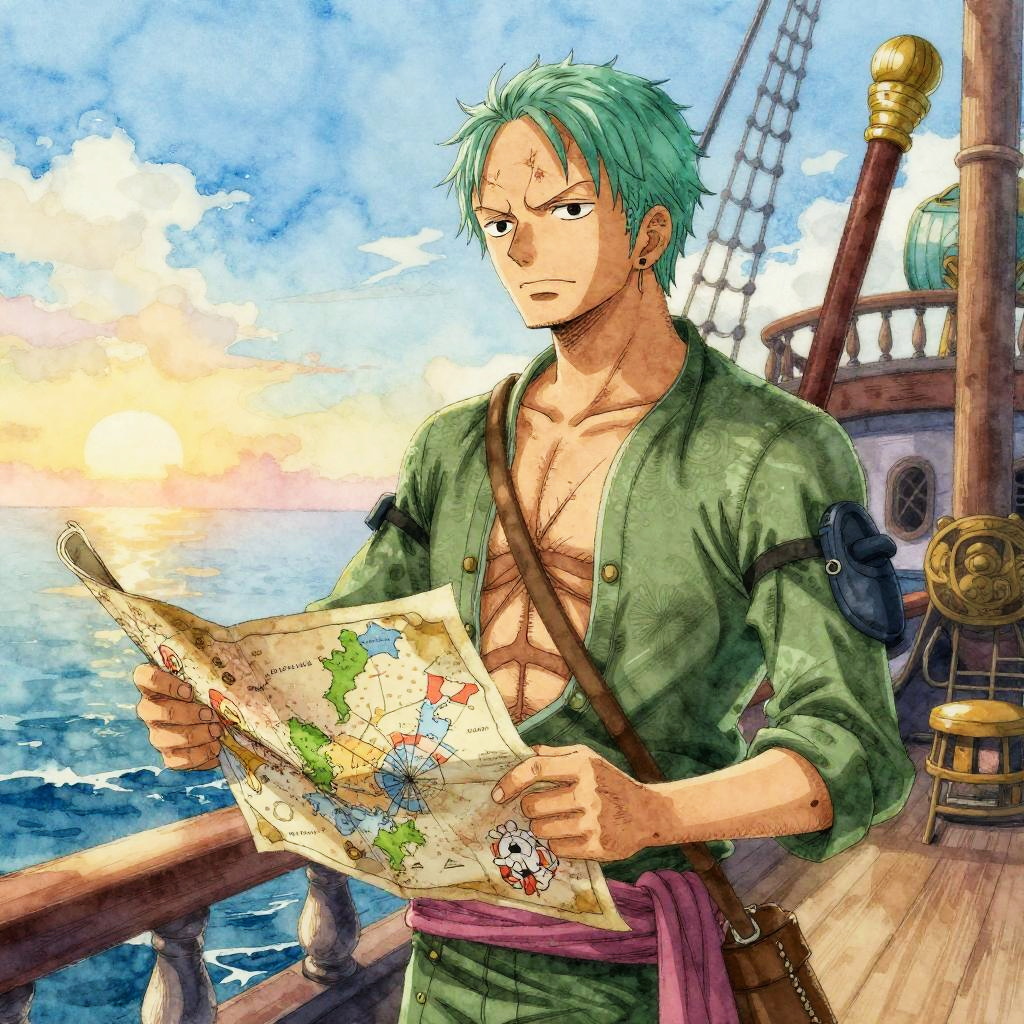 Anime-style drawing of a green-haired, shirtless pirate with a map on a ship deck at sunset, holding compass, stern expression.