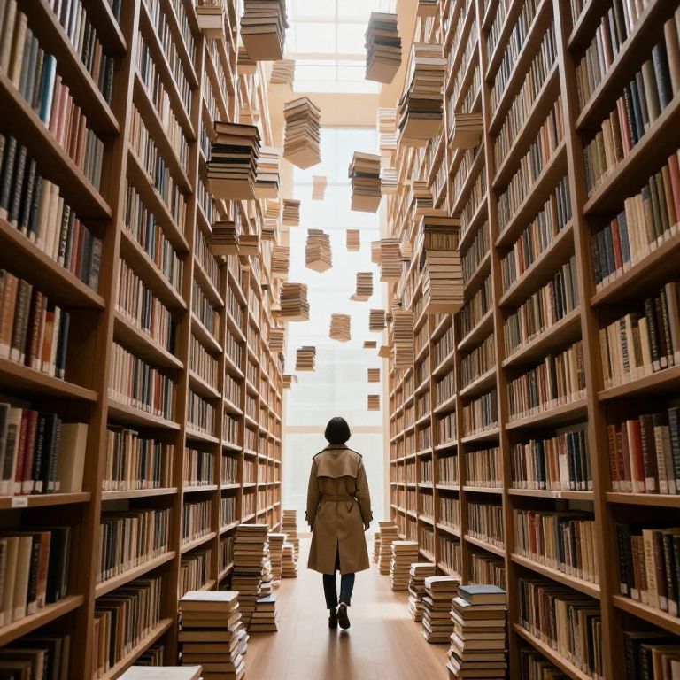 Library shelves stretch infinitely upward, flanking a central aisle where a lone figure in a trench coat ascends toward a luminous ceiling, surrounded by cascading stacks of books that float like islands in a boundless sea of knowledge.