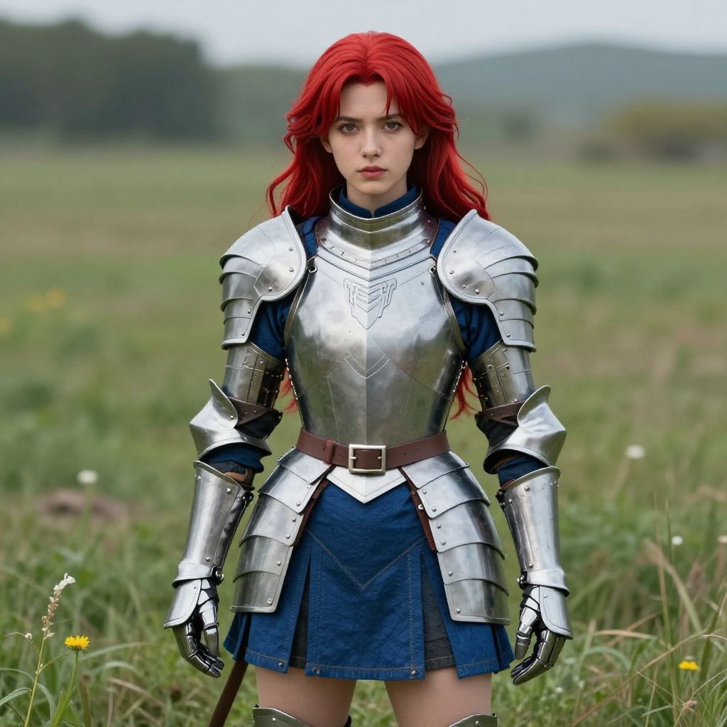 Digital artwork of a young woman with long red hair, standing in a golden field of tall grass. She wears silver medieval-style armor with blue accents and a brown belt. Her armor includes shoulder pauldrons, a chest plate with a blue emblem, and gauntlets. She has fair skin, large brown eyes, and a serious expression. The background features rolling green hills and a blue sky with scattered clouds. The image has a highly detailed, semi-realistic style with vibrant colors and sharp contrasts.