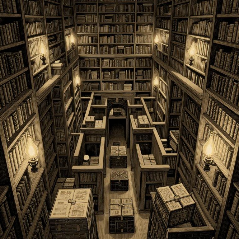 Visualize a vast, maze-like library, reminiscent of Edward Gorey's meticulous pen-and-ink illustrations, where towering bookshelves are illuminated by the soft light of flickering gas lamps. Nestled within this labyrinth of knowledge lies an enigmatic chamber, accessible only through intricate puzzle boxes and concealed corridors. From above, observe the captivating allure of this hidden sanctuary as shadows play across the walls, suggesting long-lost secrets and untold stories contained within its pages. This elaborate scene combines a sense of wonder with subtle unease, enticing viewers to explore the depths of this intriguing world of mystery and intellectual intrigue.