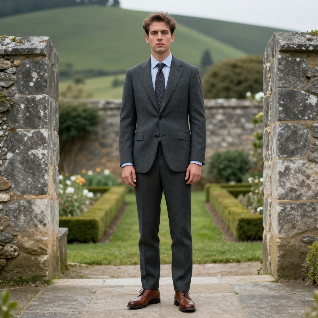 Photograph of a young Caucasian man with short brown hair standing confidently in a stone garden archway. He is wearing a dark gray, pinstriped suit with a white shirt and black tie. His brown leather shoes are polished. The background features a lush, green garden with neatly trimmed hedges and colorful flowers, leading to rolling hills under a cloudy sky. The stone archway on either side of him is weathered, with moss and lichen adding texture. His expression is serious, and he stands with his hands by his sides.