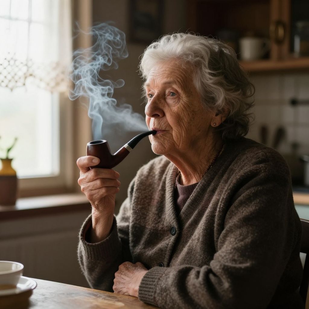 Granny smoking a vintage pipe in a cozy rustic kitchen, soft morning light filters through lace curtains, detailed wrinkles and warm ambiance, 4k realism