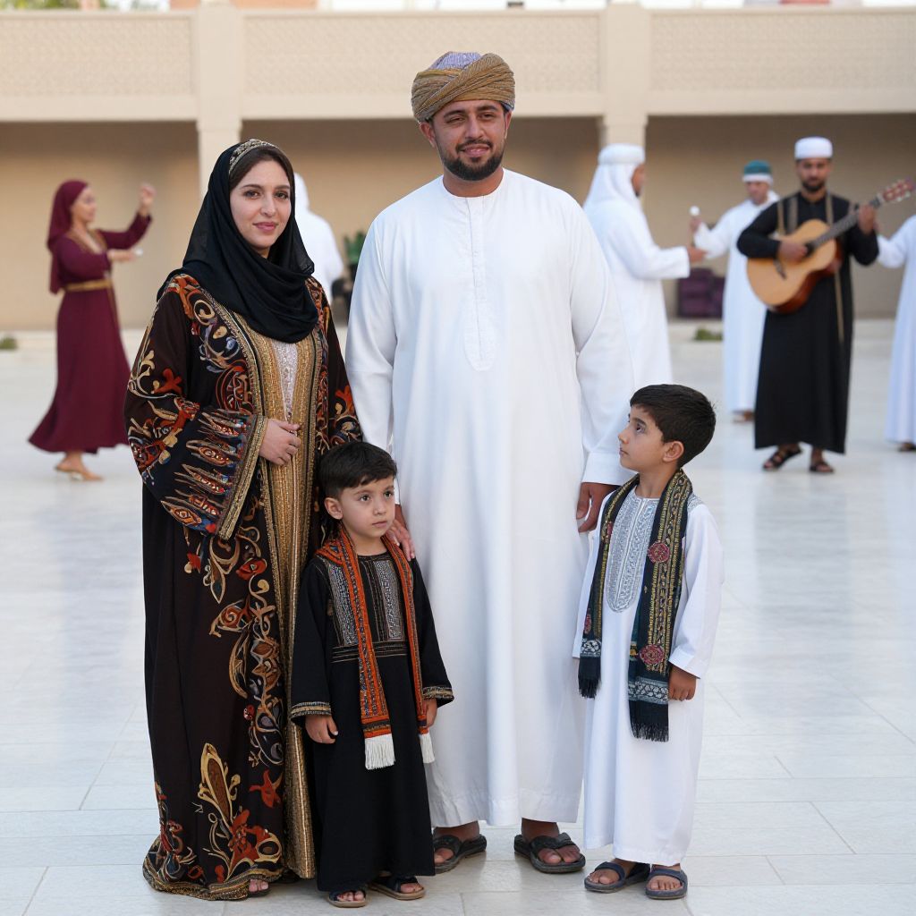A group photo of a family in traditional Middle Eastern costumes, with the mother in a richly patterned abaya and head covering, the father in a long white thobe with a turban, and two children in embroidered tunics and scarves, gathered in a large courtyard during a cultural celebration in Tabuk, with traditional music and dancing in the background.