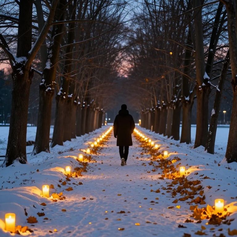 A solitary figure walks down a snow-covered path lined with bare trees, illuminated by a carpet of golden candles and scattered autumn leaves glowing like fallen stars beneath a twilight sky.
