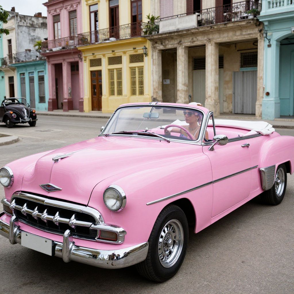 A woman enjoys a leisurely drive through the vibrant streets of Havana in a glossy vintage pink convertible, capturing the essence of retro charm with its classic design and rich, high-definition details.