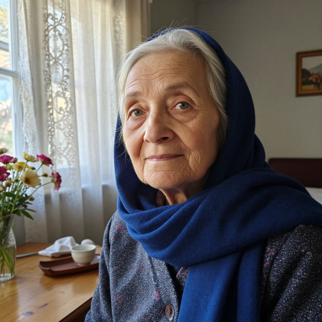 Photograph of an elderly woman with fair skin, white hair peeking from under a dark blue headscarf, and wrinkled, expressive face. She wears a dark blue, textured sweater. She is seated indoors near a wooden table with a vase of colorful flowers, a pair of white shoes, and a small bowl. Light filters through lace curtains in the background, casting soft shadows. A small, framed picture hangs on the white wall to the right. The overall atmosphere is warm and homely.