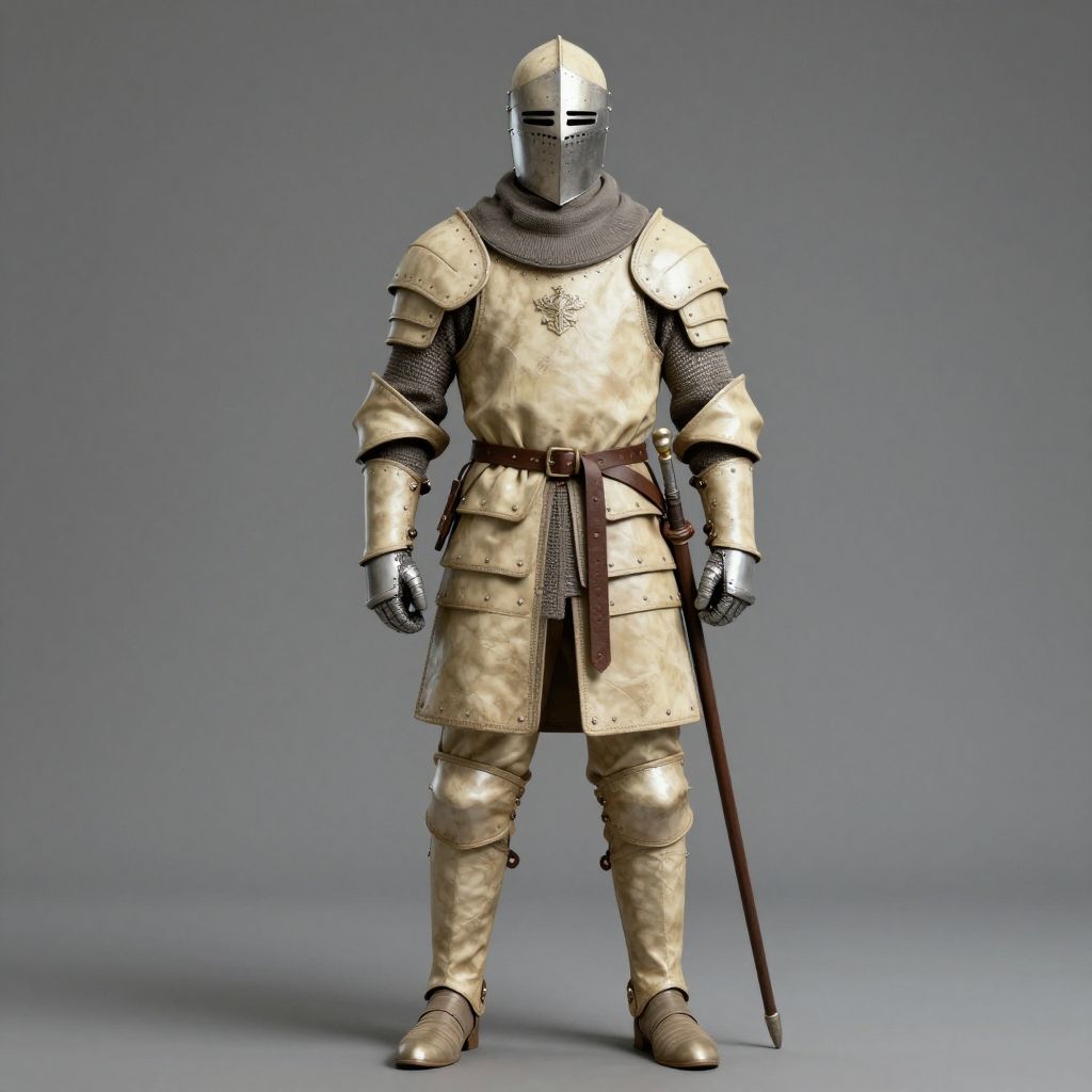 Hyper-realistic, Realism, HDR, detailed, medieval warior style, beige-flesh leather, armor with pants with boots, simple gray background